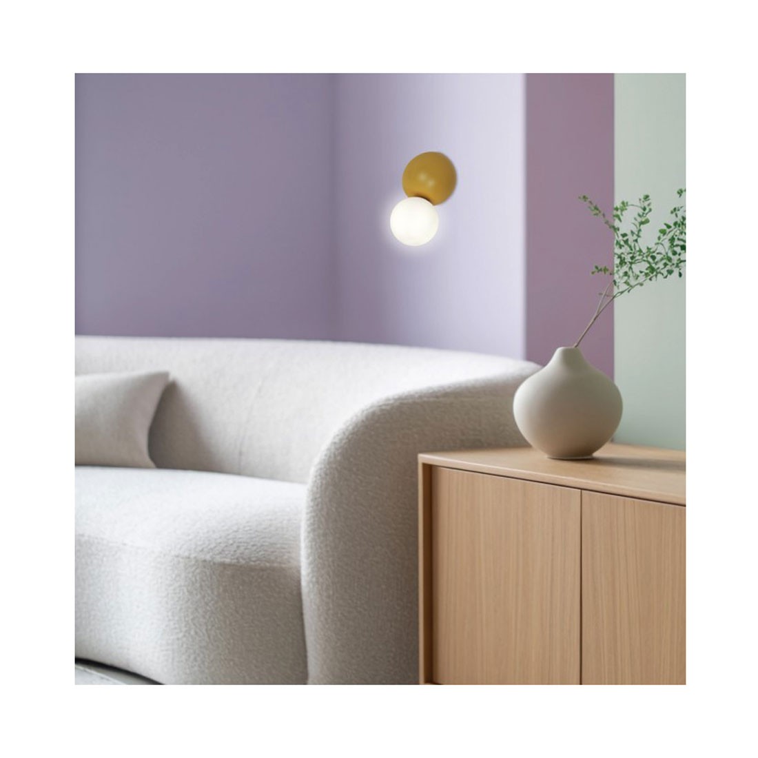 Lámpara de pared con 1 luz de metal amarillo y tulipa de cristal bola blanca de 10 cm.