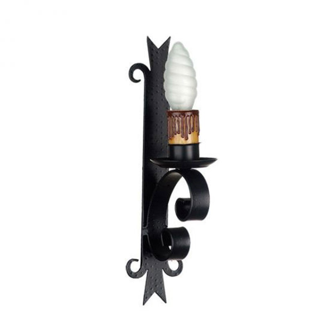 Aplique de Pared 1 luz terminado en forja negro con pletina a pared con extremos caracoleados. Altura 38cm.