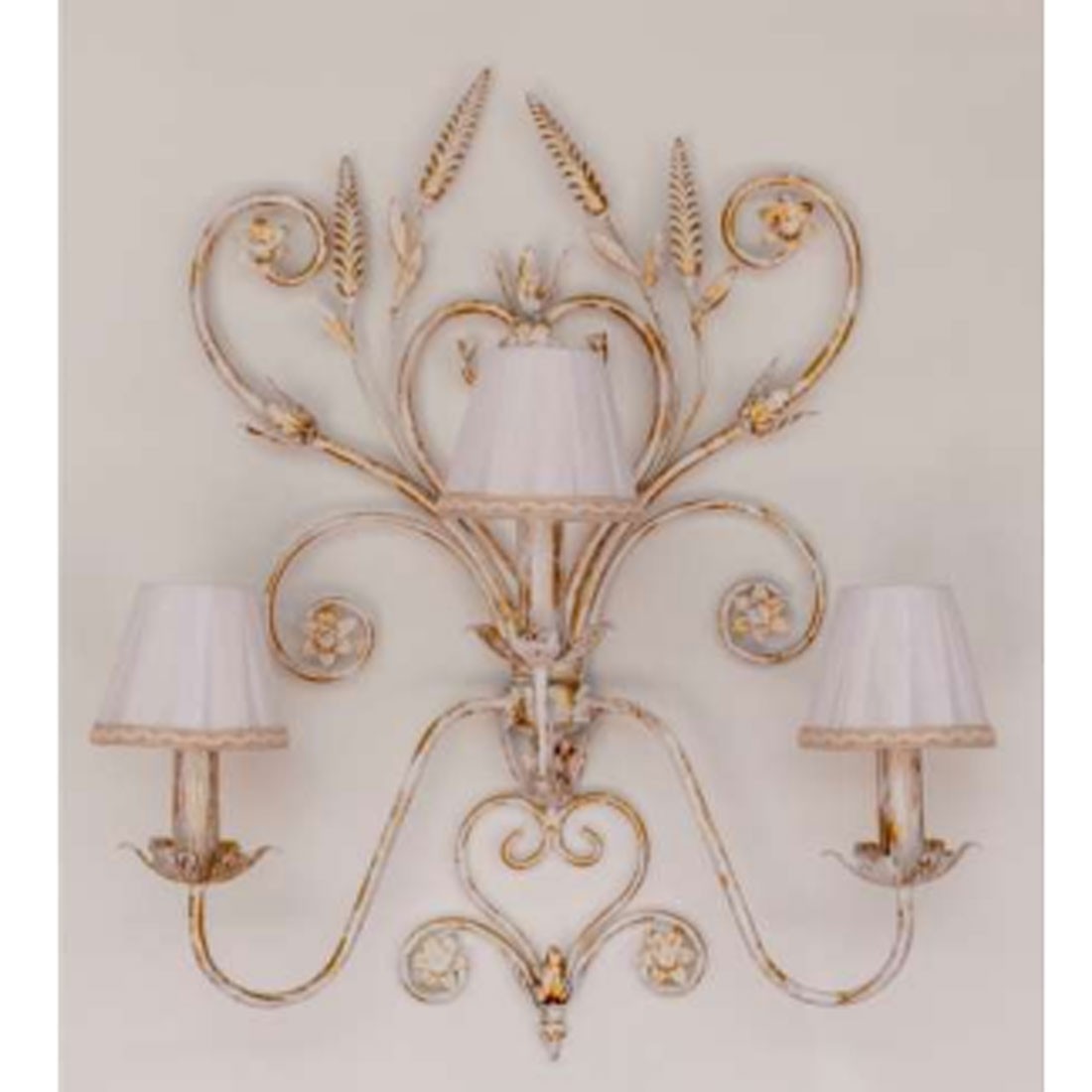 Aplique de Pared de 2 Luces de forja acabado blanco oro con pantallas de tela con pasamanería. Lámparas fabricadas en España.