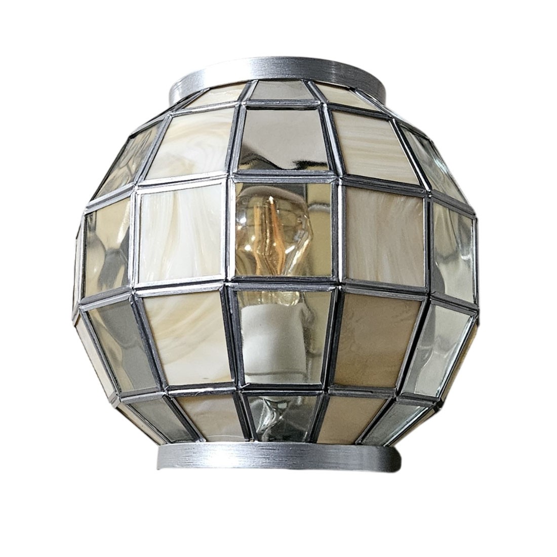 Aplique de pared media bola con 1 Luz realizado en estaño pintado plata y combinación de opalina con luna transparente. Diámetro 25 cm.