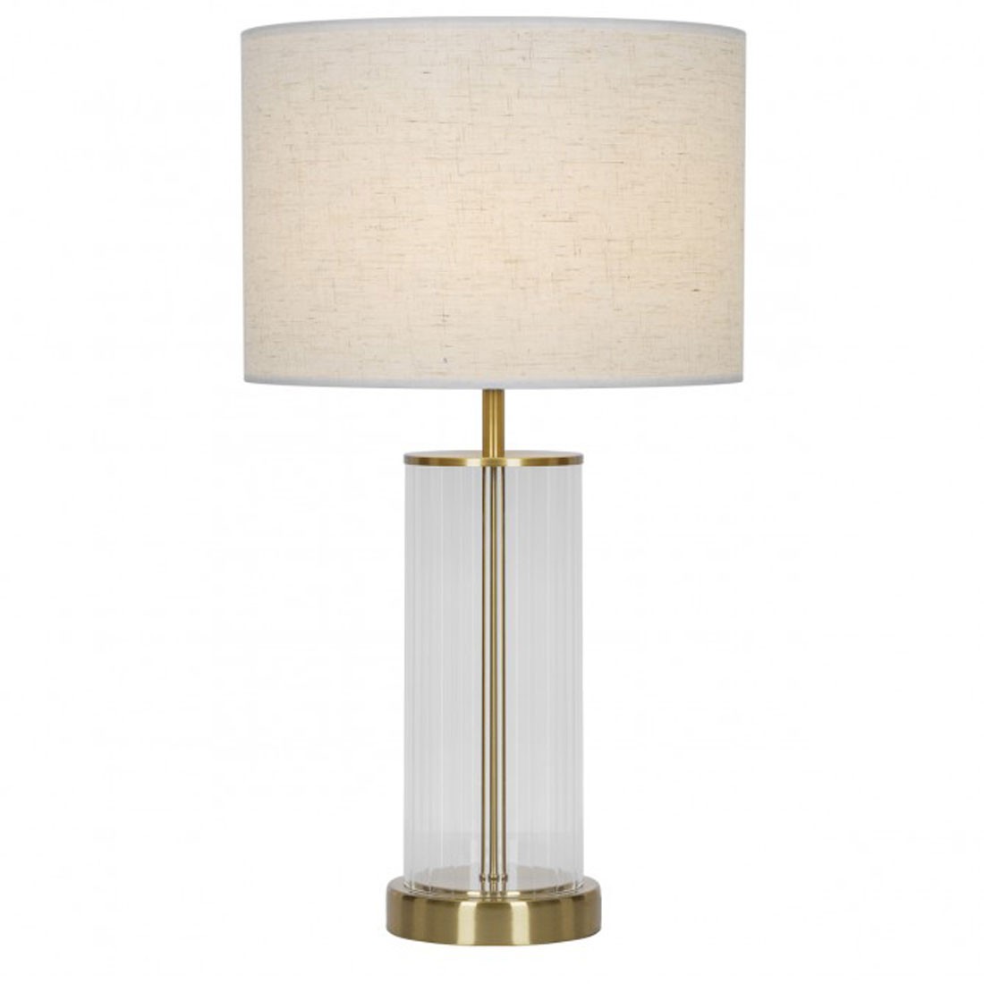 Lámpara de Sobremesa de 1 Luz Base de metal acabado cuero, cuerpo de cristal y Pantalla de Tela de 28 cm de Diámetro.