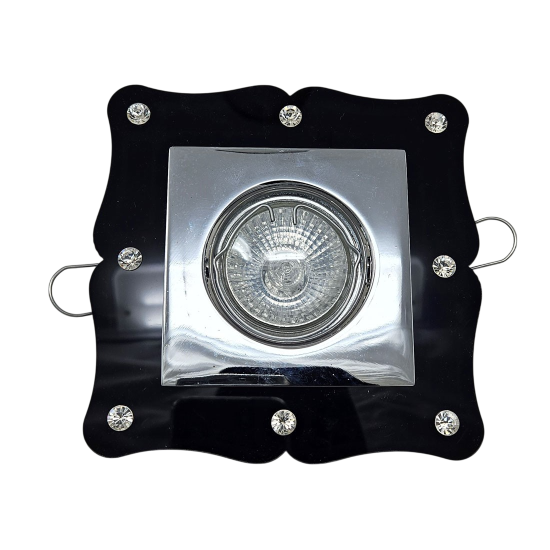 Empotrable cuadrado Acabado metacrilato Negro con empotrable de metal cromado y incrustaciones de cristales facetados. Anchura 14 cm. Diámetro de corte a partir de 8 cm. Portalámparas MR16 Y GU10 incluido.