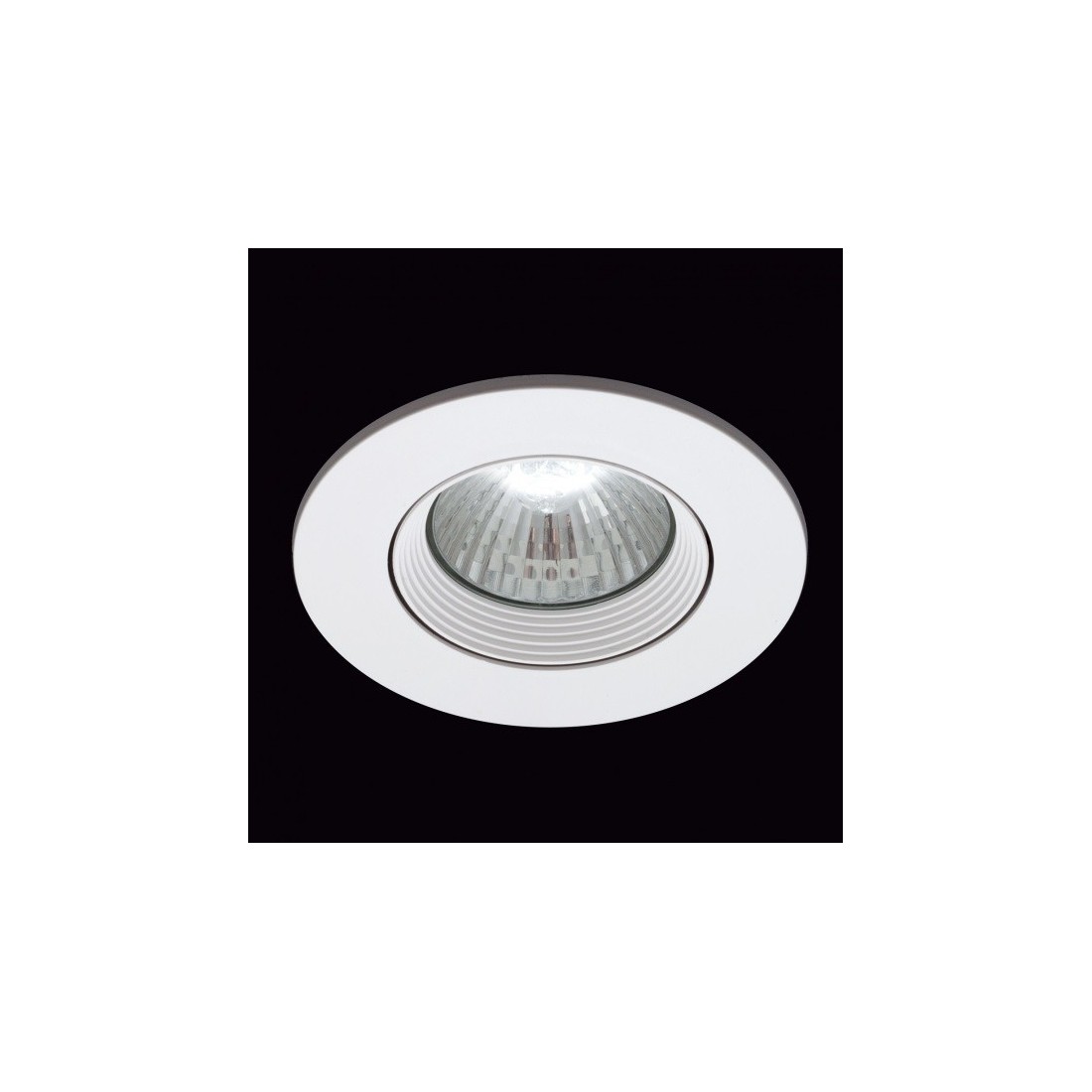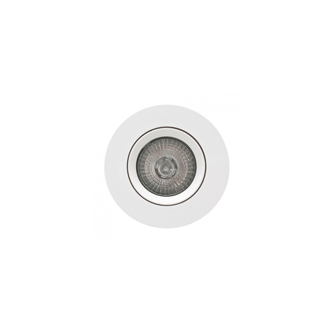 Foco Empotrable de PVC acabado blanco. Diámetro 9 cm. Corte 7,5 cm. Orientable. Ángulo de apertura 100º. Textura interior rugosa.