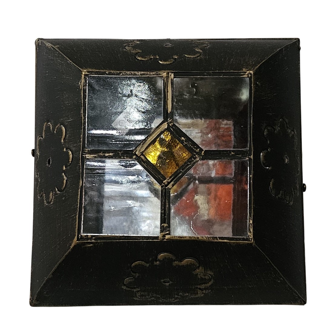 Plafón de Techo de 1 Luz realizado en estaño pintado viejo y combinación de ámbar vidriera con gótico transparente. Diámetro 20 cm.