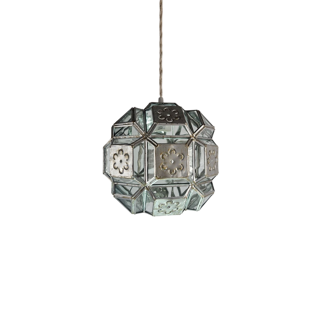 Farol de Techo de 1 Luz realizado en estaño calado con cristal transparente y terminación en pintura plata envejecida. Altura ajustable.