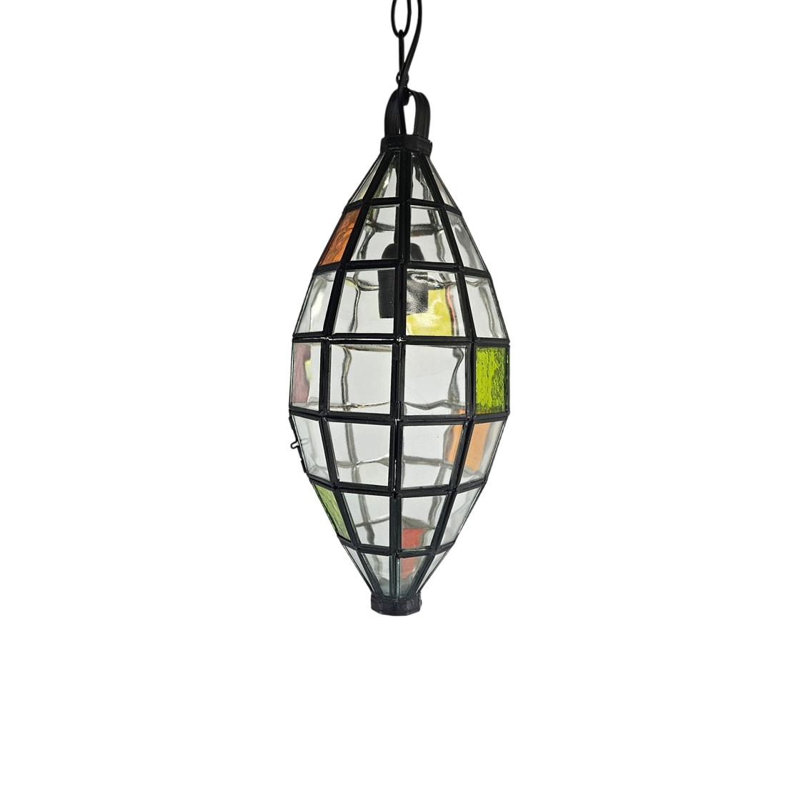Farol de Techo de 1 Luz de metal acabado viejo con florón negro y cristal con formas geométricas vidriera color y transparente luna. Medidas 22*52 cm. Altura ajustable. IP20.