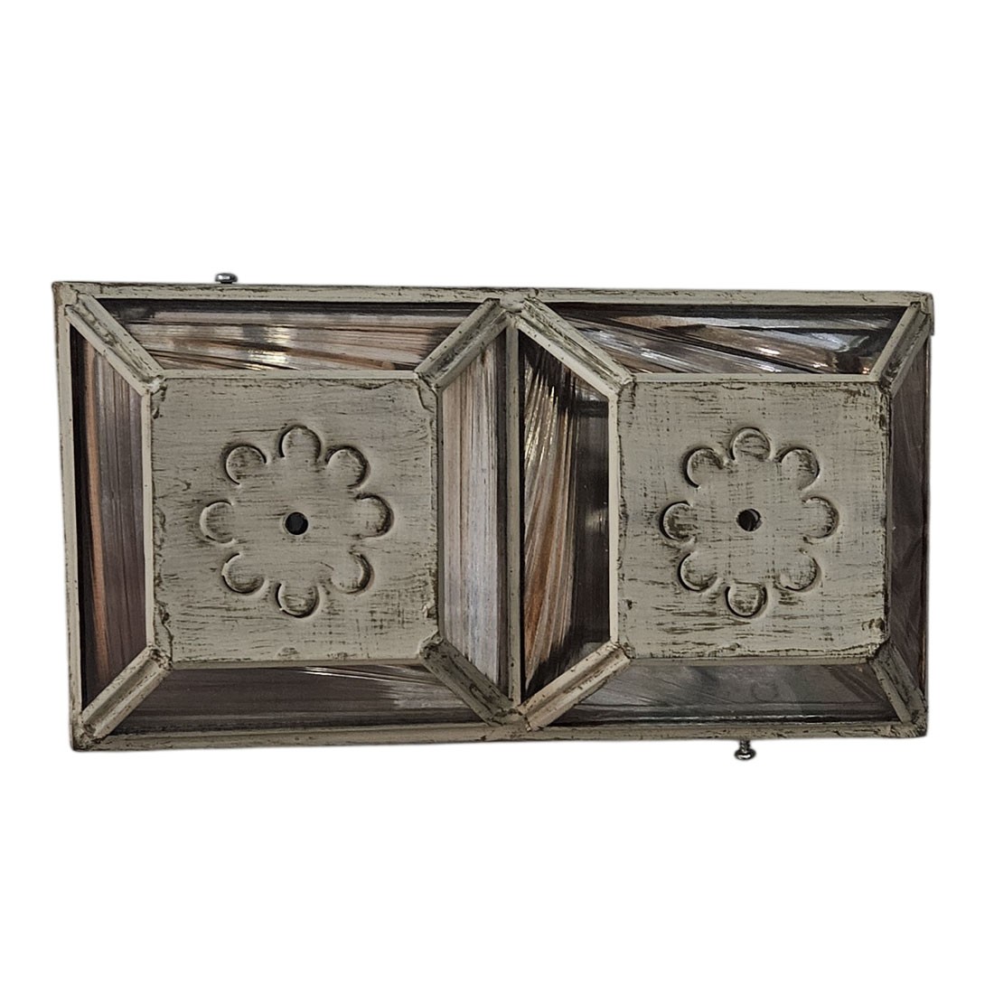 Plafón/Aplique de 2 luces realizado en estaño pintado crema vieja con calado y cristal opalina combinado con berona. Ancho 31 cm.