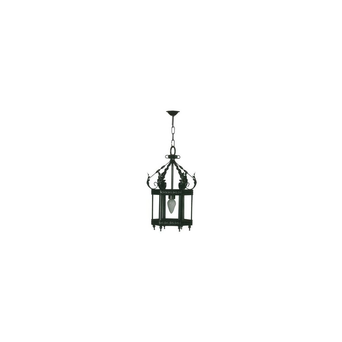 Farol de Colgar de Forja Negro 6 Caras. 1 Luz, Bombillas Bajo Consumo. Altura Ajustable.