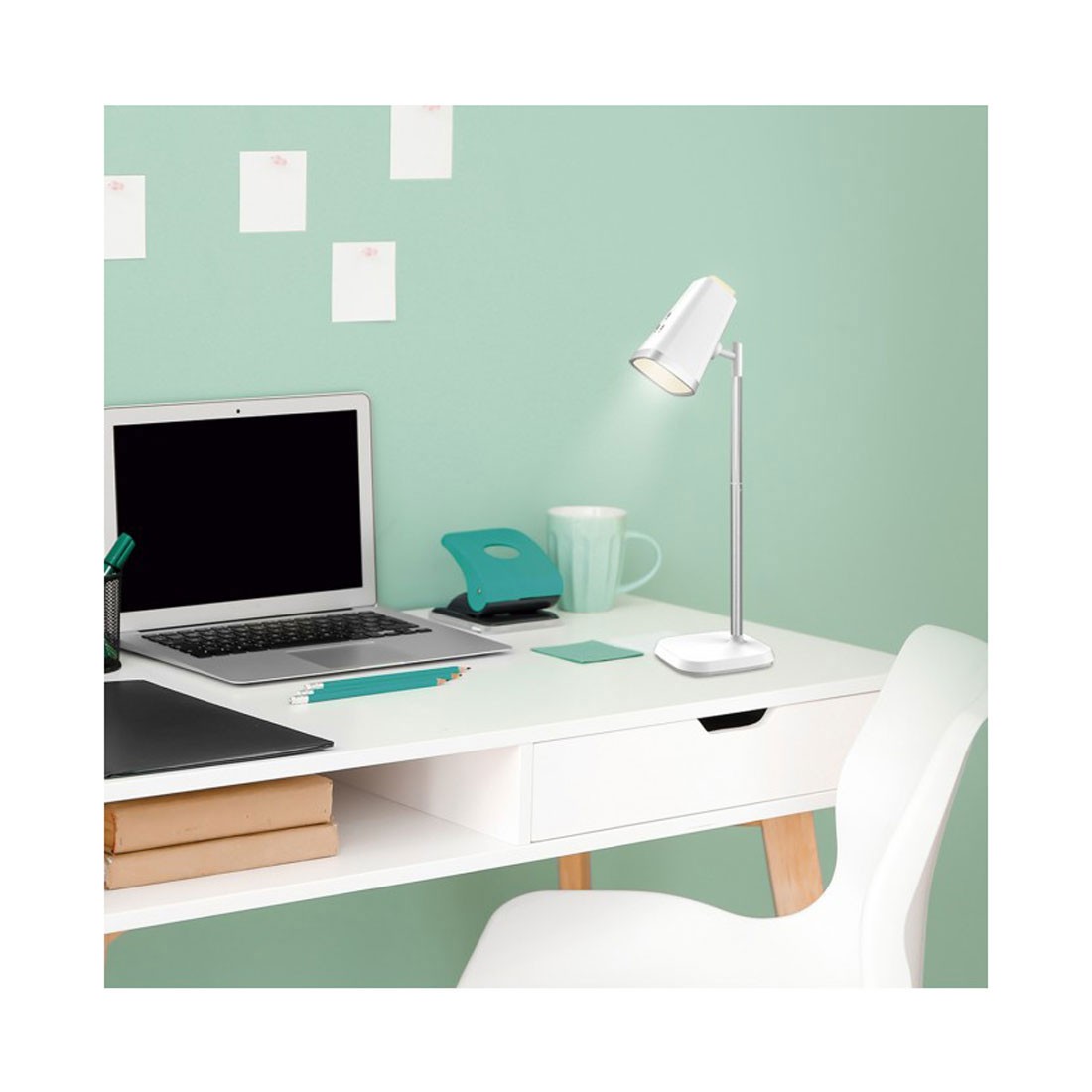 Flexo Led de ABS y aluminio blanco, opción de ponerlo en distintas posiciones como flexo, aplique, sobremesa o linterna.