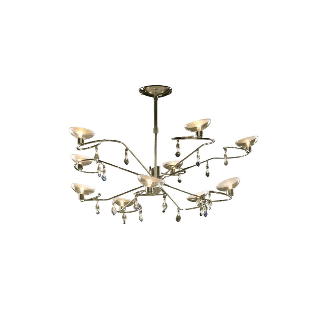 Lámpara 10 luces de metal acabado cromo. Gotas entrelazadas de cristal azules(disponible con gotas ambar. Consultar)