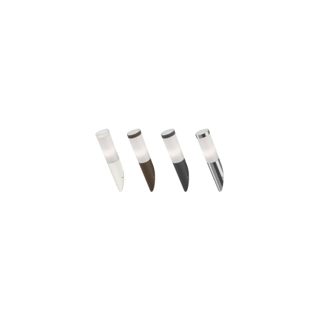 Colección formada por aplique de pared a juego con balizas en dos tamaños y en colores blanco, marrón, gris urbano y acero inoxidable.