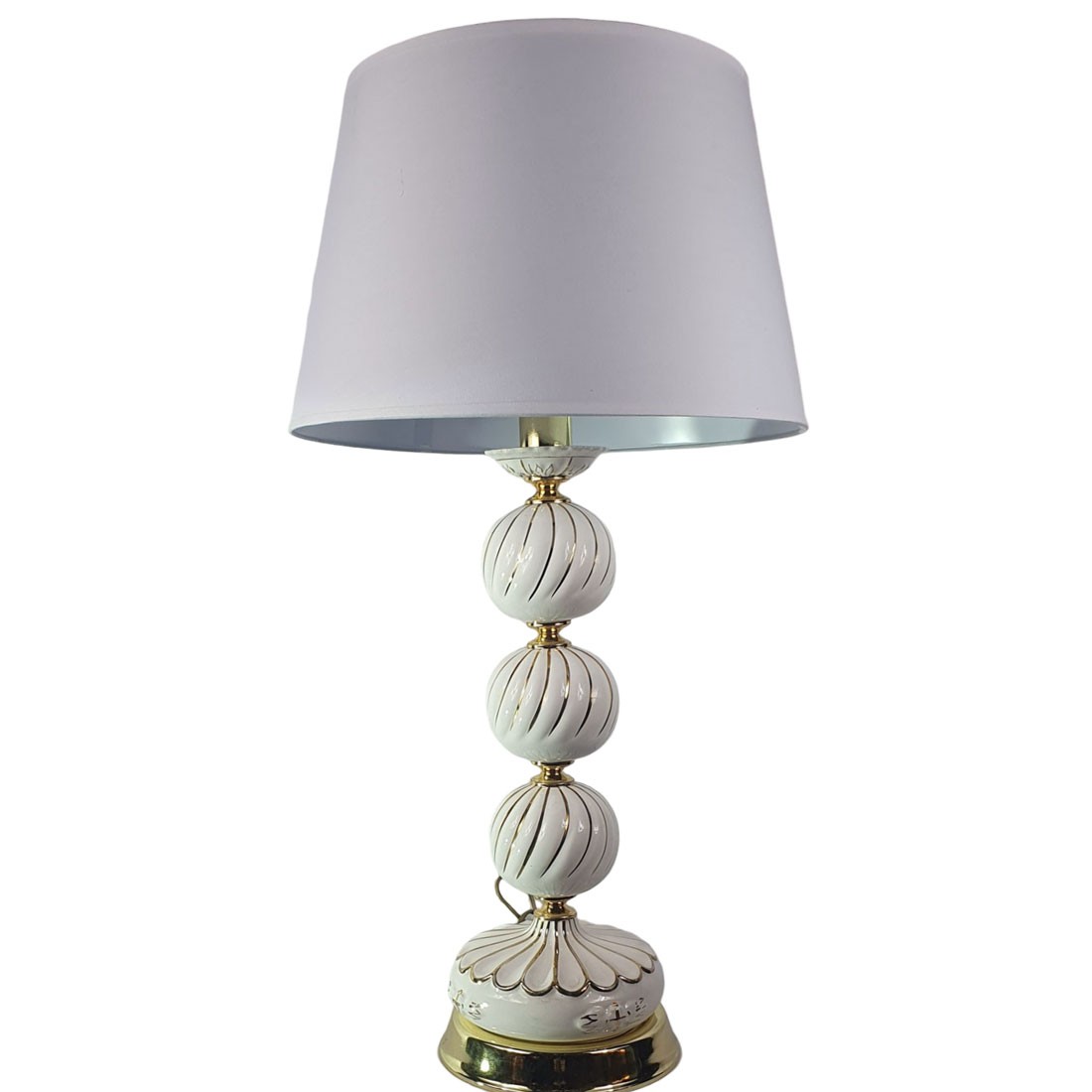 Lámpara Rinconera de 1 luz acabada en metal dorado y cerámica blanca raya oro. Pantalla de 40 cm de diámetro Blanca.