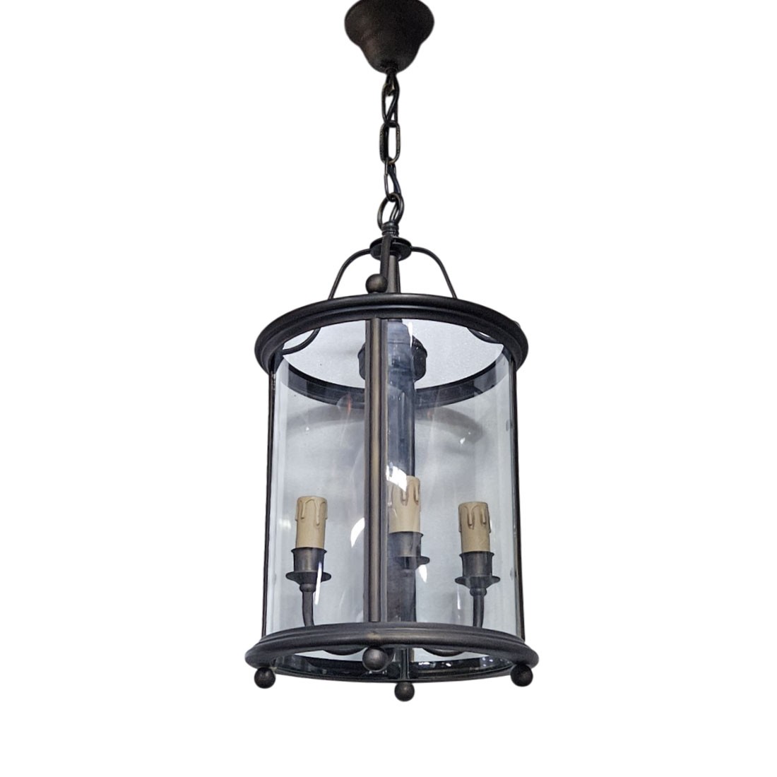 Farol de latón 4 caras con cristal transparente acabado cuero oscuro.