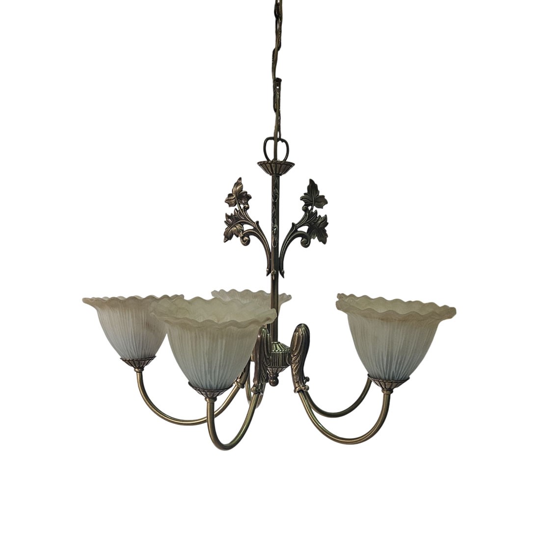 Lámpara de techo de 5 luces de bronce acabado cuero satinado con tulipas de cristal patina beige. Altura ajustable. Diámetro 55 cm.