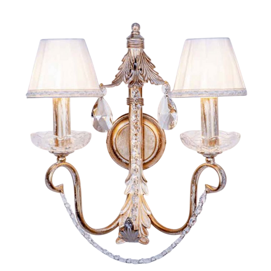 Aplique de Pared de 2 Luces fabricado en forja acabado blanco oro y pantallas de tela pasamanería con portapiñas y almendros de cristal. Lámparas fabricadas en España.