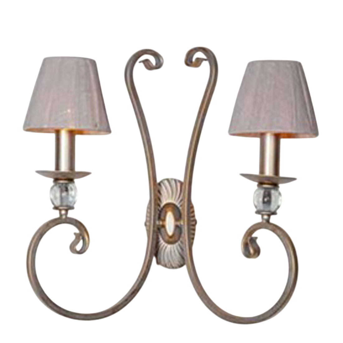 Aplique de Pared de 2 Luces fabricado en forja acabado plata oro y pantallas de tela. Lámparas fabricadas en España.