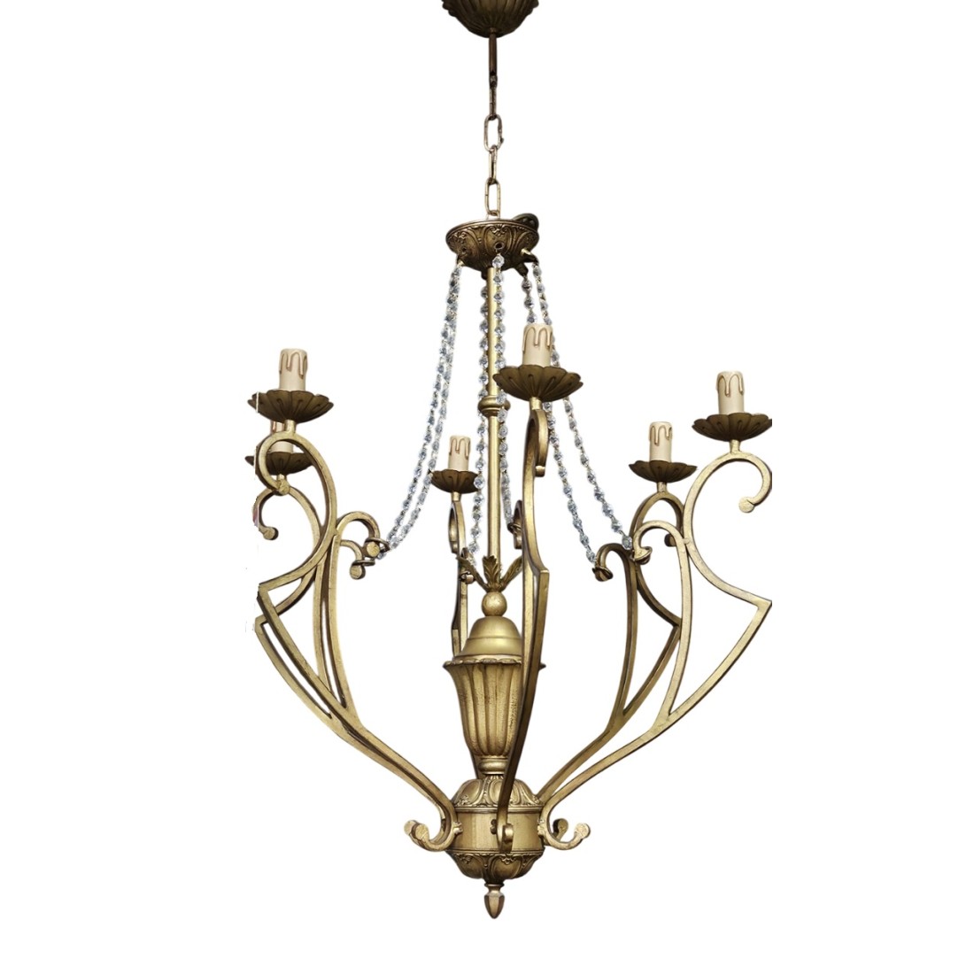 Lámpara de Techo de 6 Luces de forja acabado oro patinado con copens de cristal. Lámparas fabricadas en España. Altura ajustable. Diámetro 61 cm