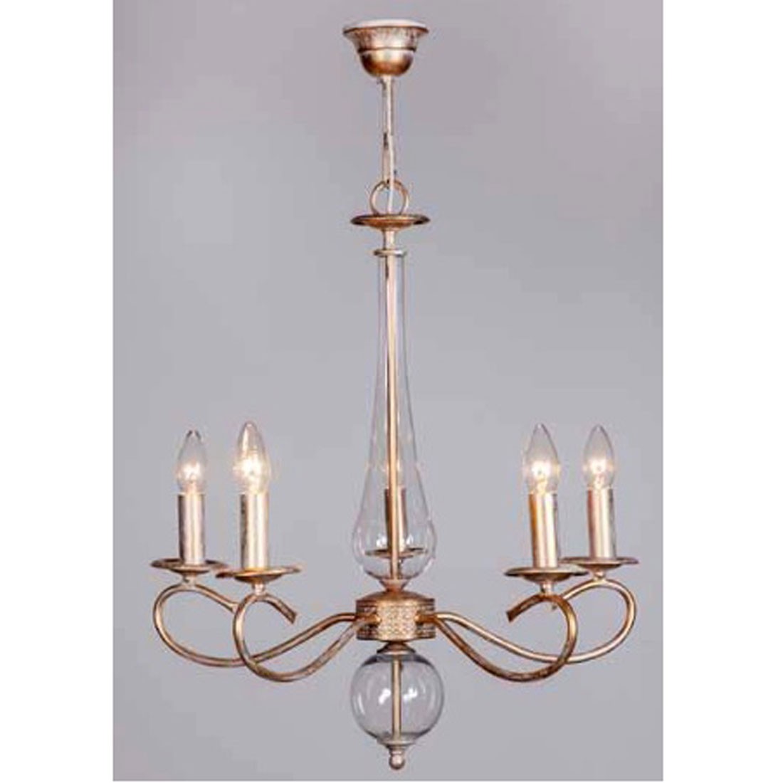 Lámpara de techo con 5 Luces realizada en Metal acabado blanco oro con columna de cristal.