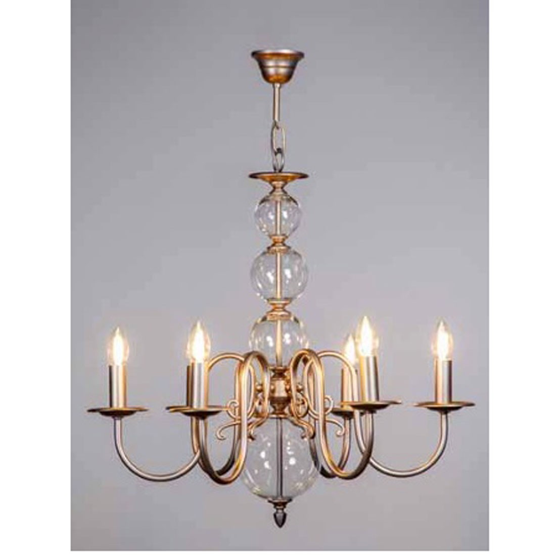 Lámpara de techo estilo holandesa de 6 Luces realizado en Metal acabado plata oro y bolas de cristal transparentes.