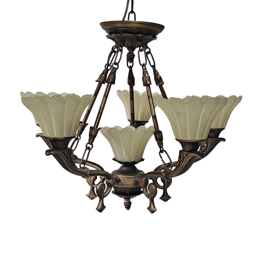 Lámpara de Techo de 6 luces de bronce fundido con patina dorada envejecida y tulipas de cristal pétalo beige. Altura ajustable.