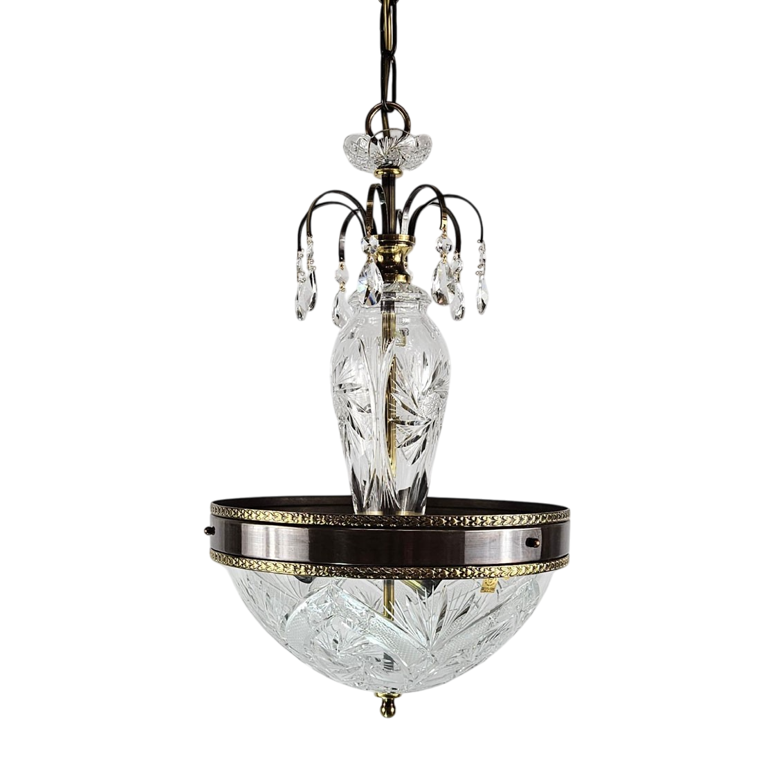Lámpara de Techo Colgante de 3 Luces de bronce acabado cuero con tulipa y cuerpo de cristal de bohemia.