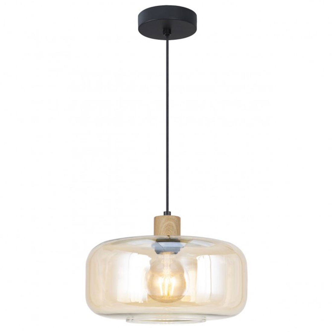 Lámpara de Techo Colgante 1 Luz Cristal ambar y montura negra y madera. Diámetro 28 cm. Altura ajustable.