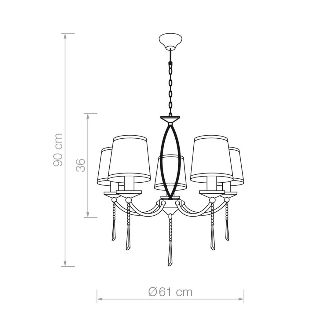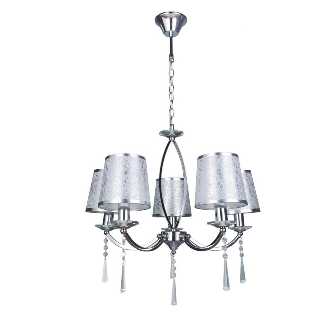 Lámpara de Techo Colgante de 5 Luces de metal acabado cromo con pantalla moteada filo plata y copens de cristal. Altura ajustable. Diámetro 61 cm.
