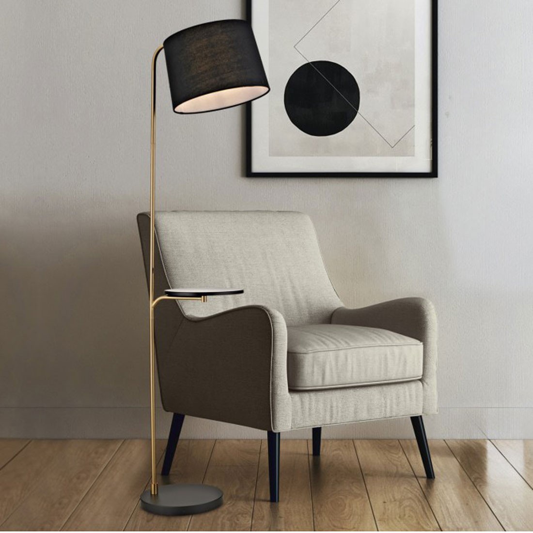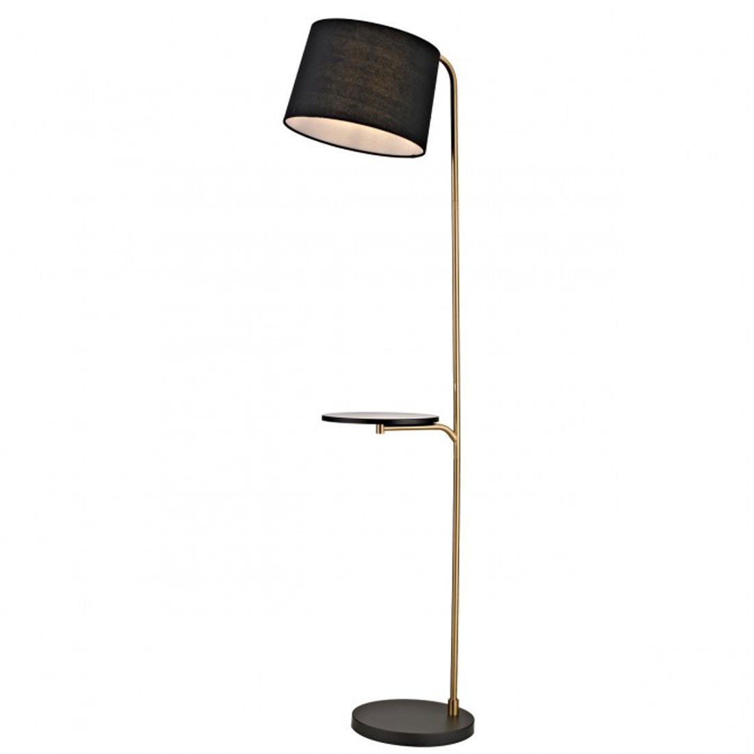 Lámpara de Pie con mesa de 1 Luz de metal acabado latón y pantalla textil negra. Alto 160 cm.