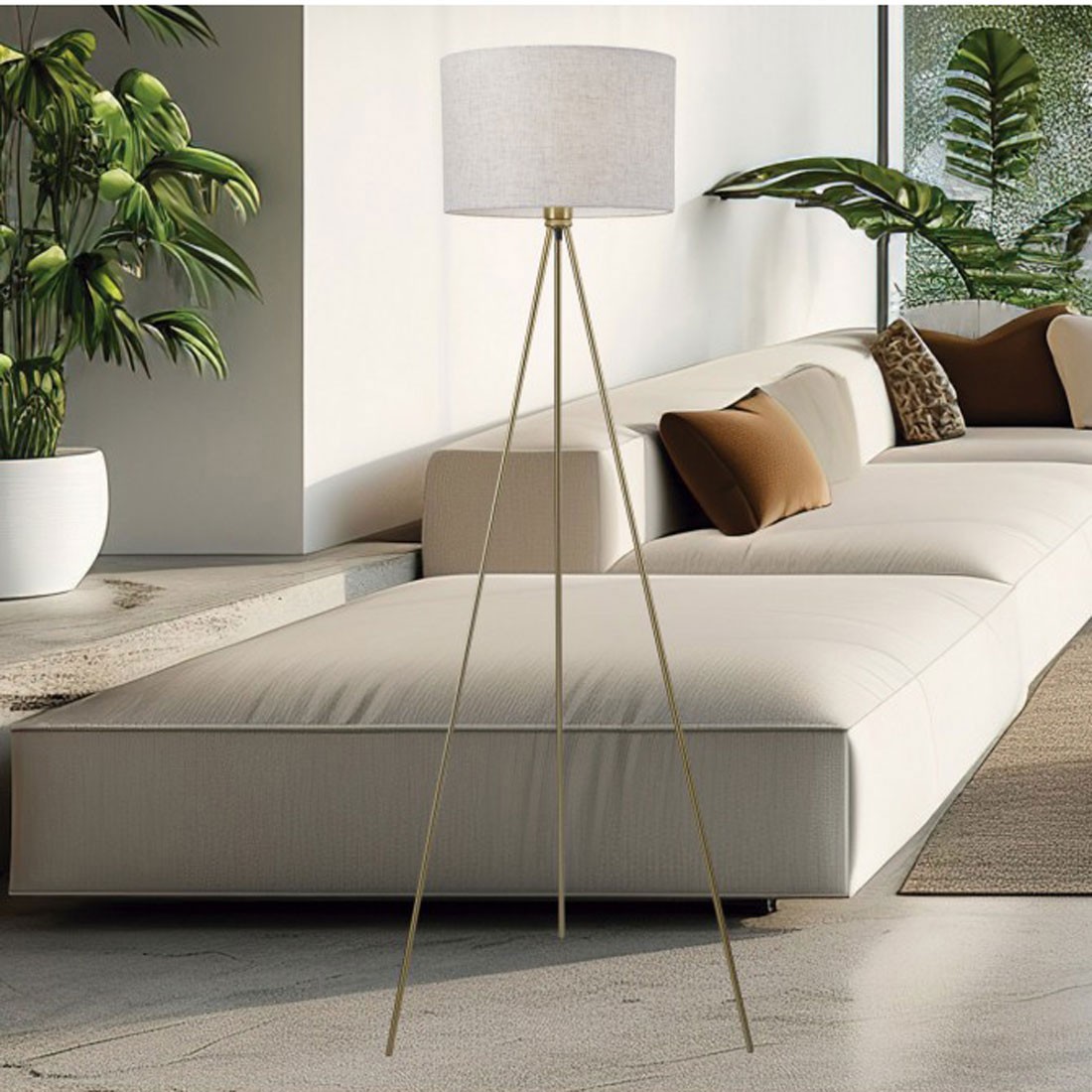 Lámpara de Pie de Salón trípode de 1 Luz de metal latón con pantalla de tela de lino.