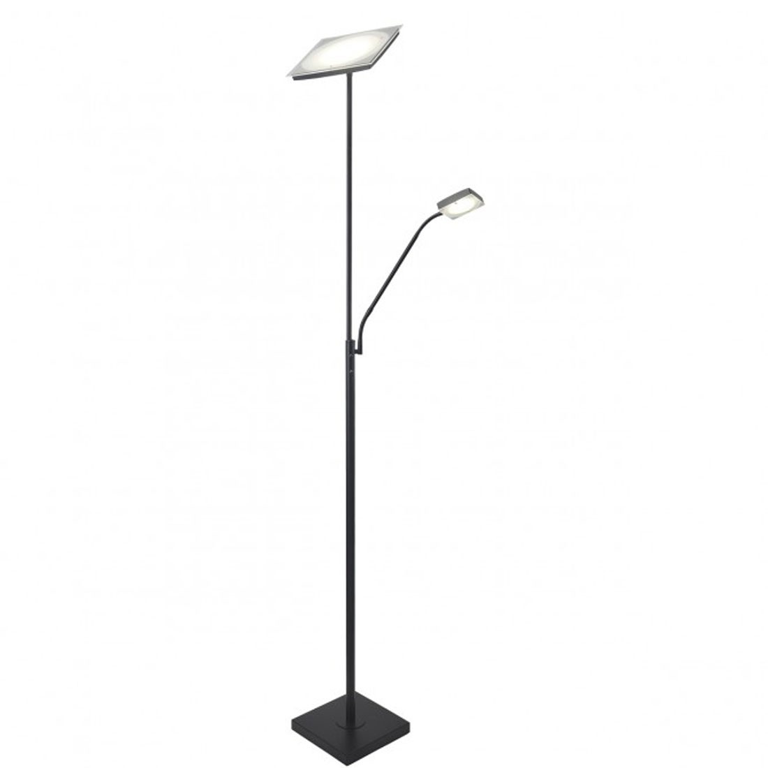 Lámpara de Pie de Salón Led con Lector, estructura de metal y cristal acabado negro.