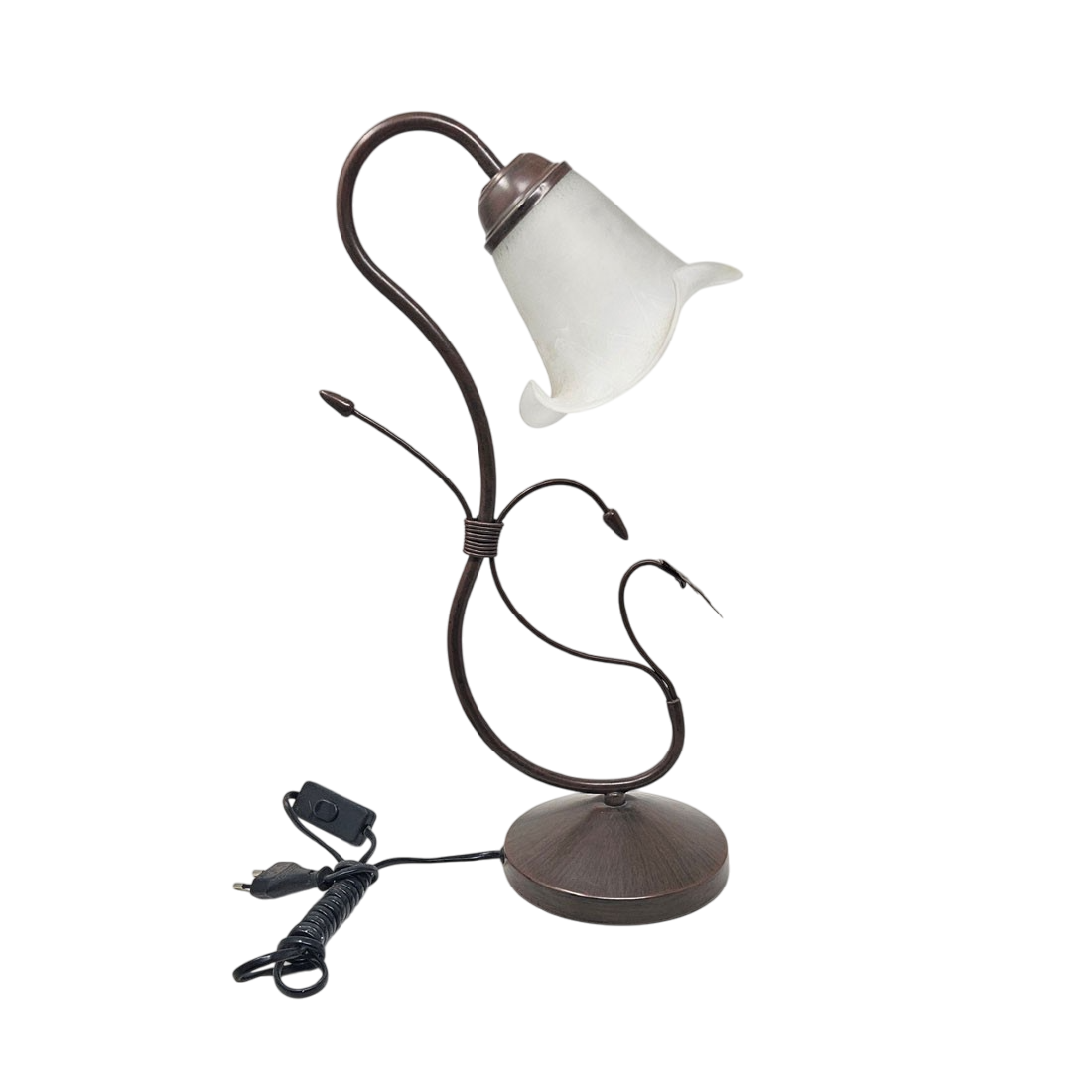 Lámpara de sobremesa de 1 Luz de metal pátina marrón con tulipa de cristal blanca y detalle de hoja.