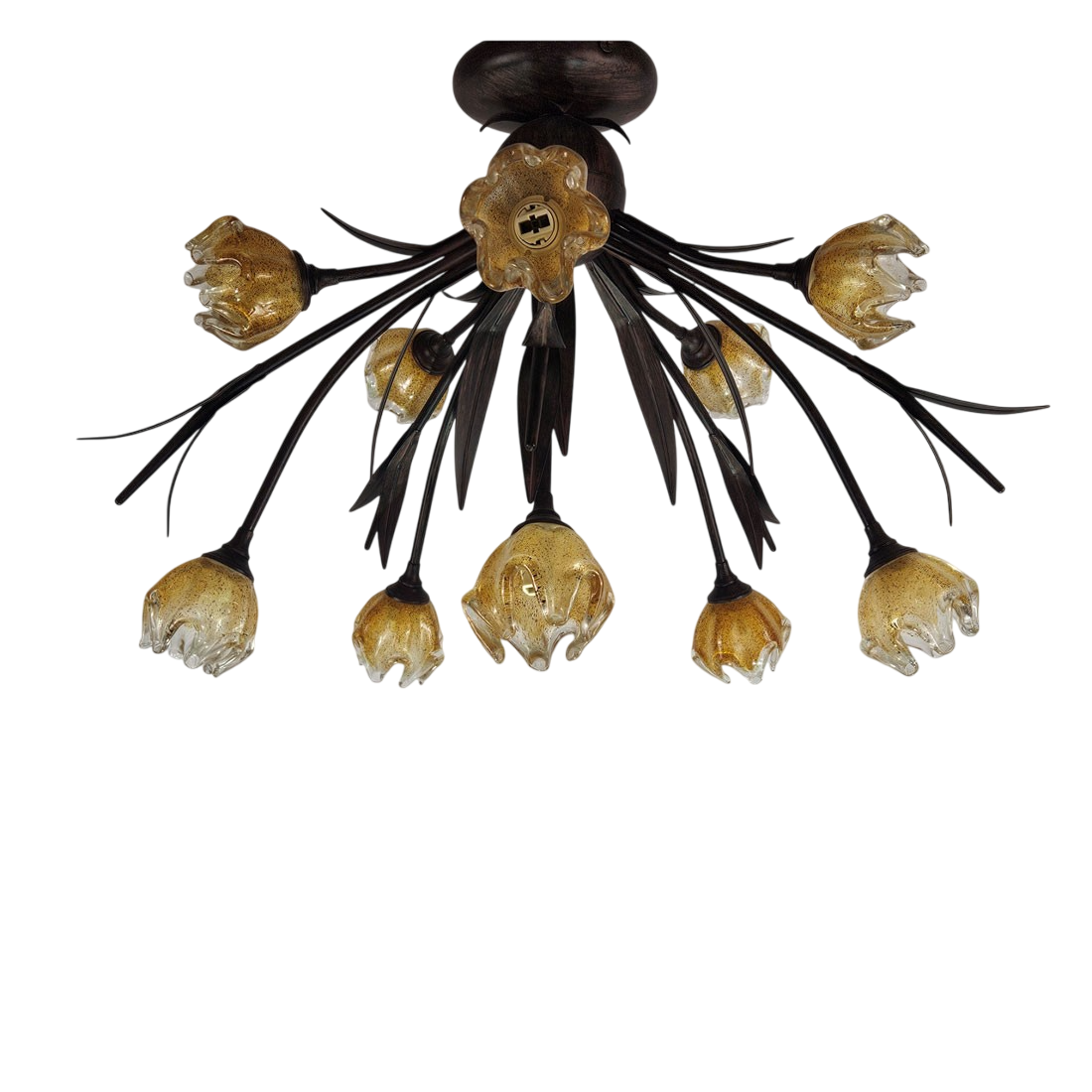 Lámpara de Techo plafón de 10 Luces de Forja con hojas patina Marrón y Tulipas de Cristal moteada beige.