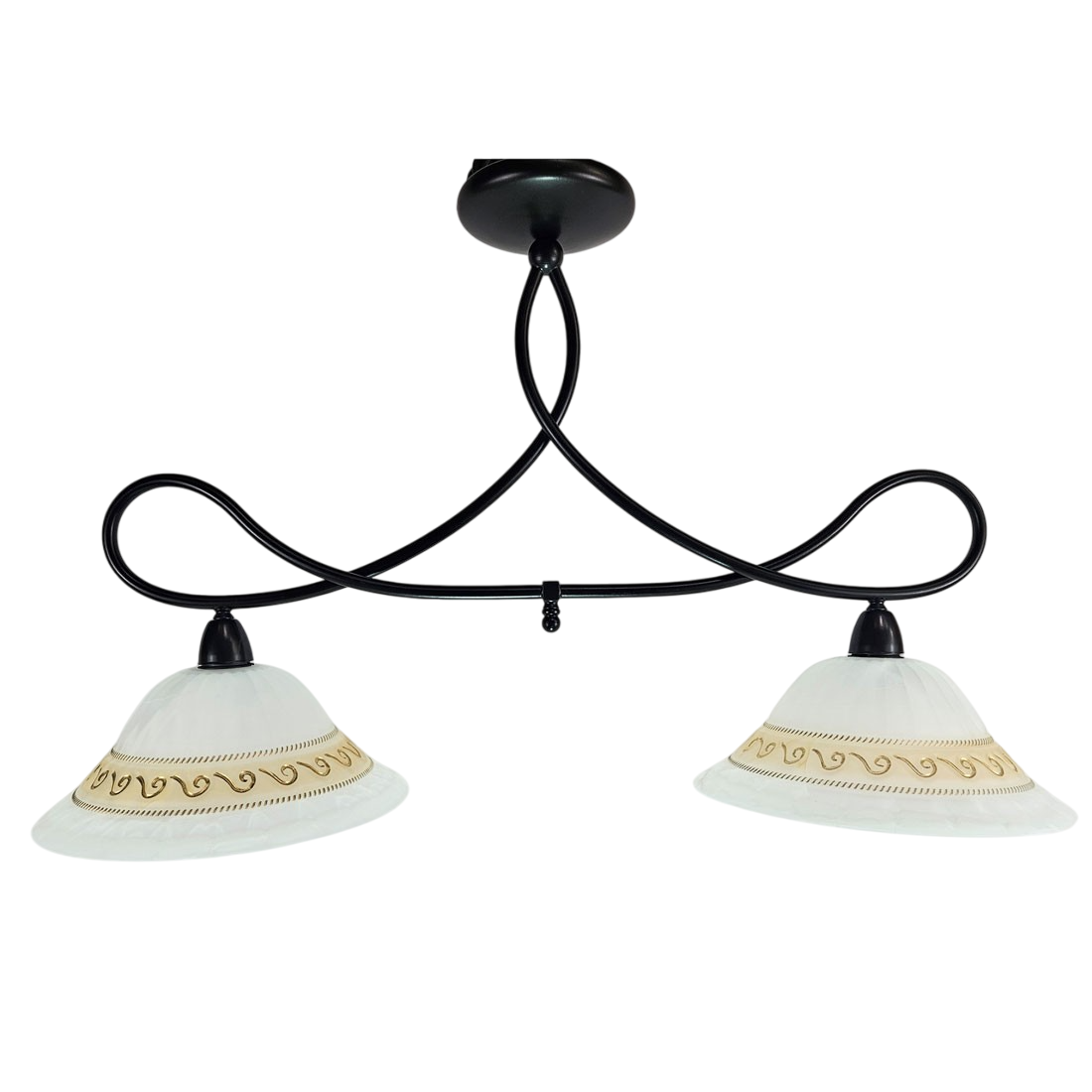 Lámpara de Techo plafón acabado negro forja con Tulipas de cristal de 30 cm blancas con cenefa.