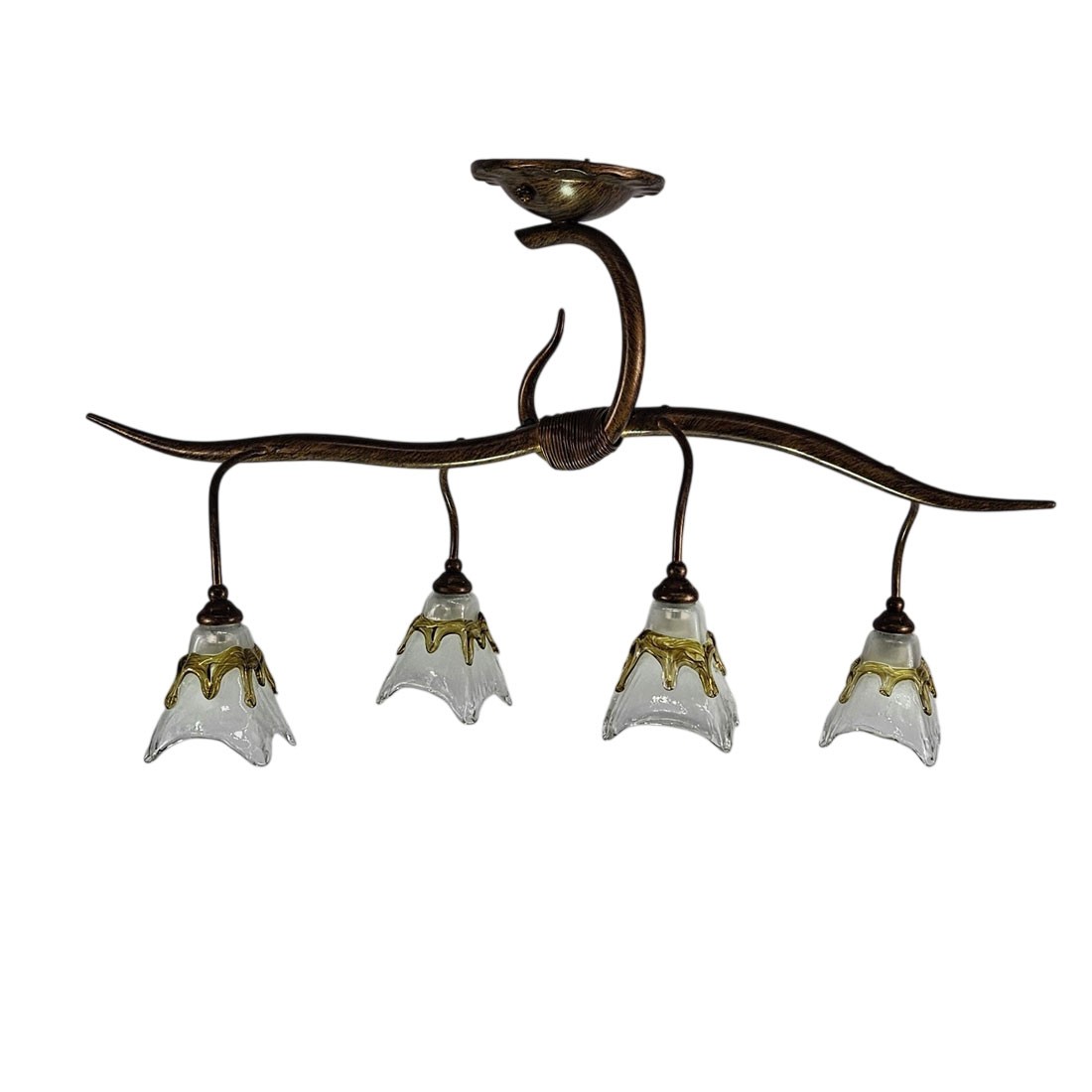Lámpara plafón de metal acabado patina dorada con tulipa cristal soplado acido y caramelo.