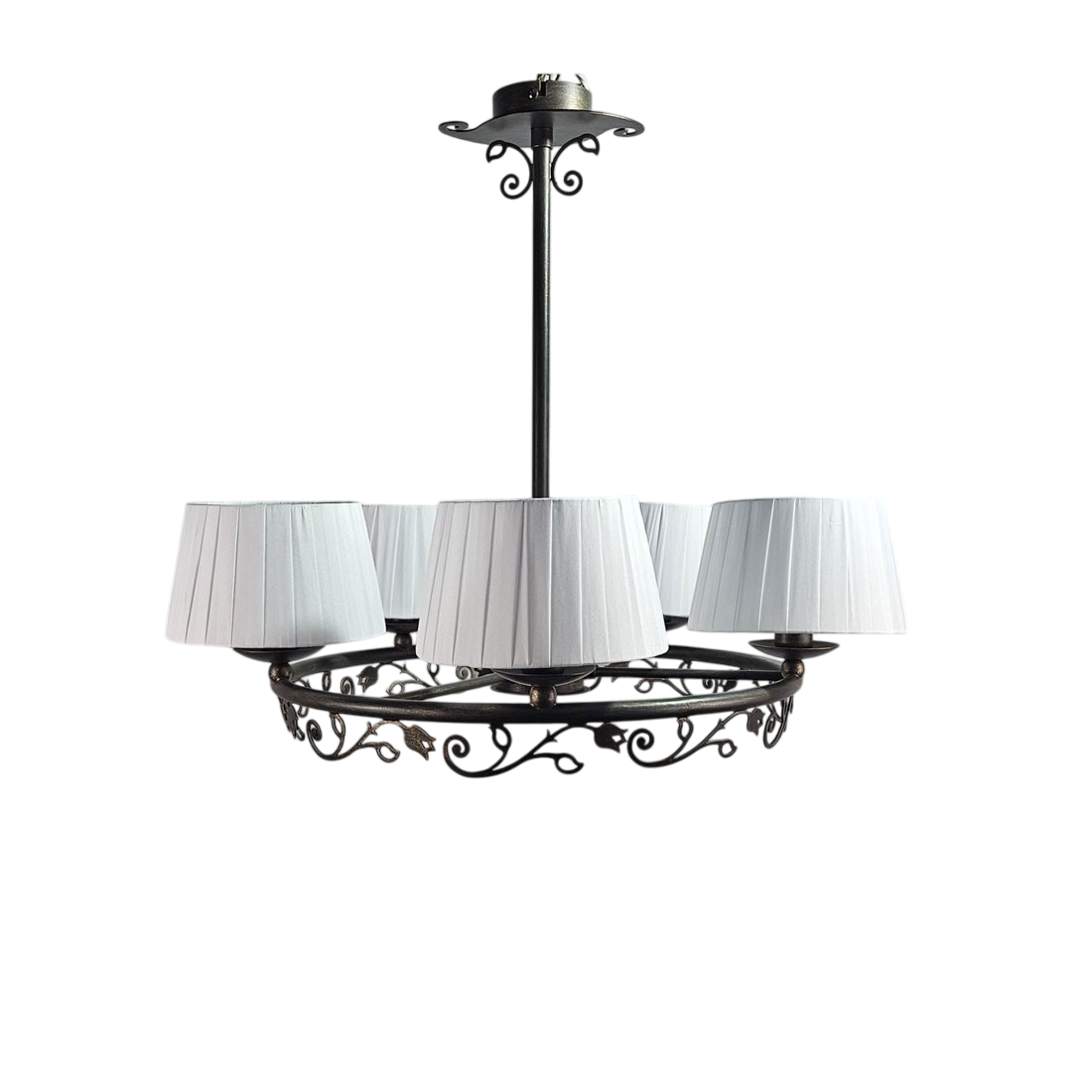 Lámpara de Techo de metal acabado oro viejo con pantalla de tela plisada blanca.