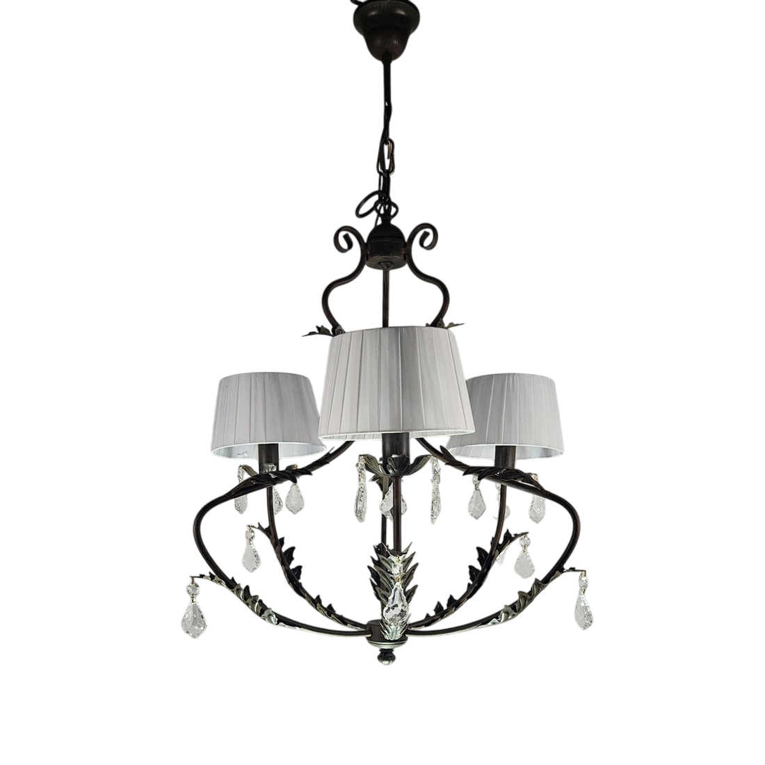 Lámpara de Techo de metal acabado marrón óxido con pantalla de tela plisada blanca y almendros de cristal transparentes.