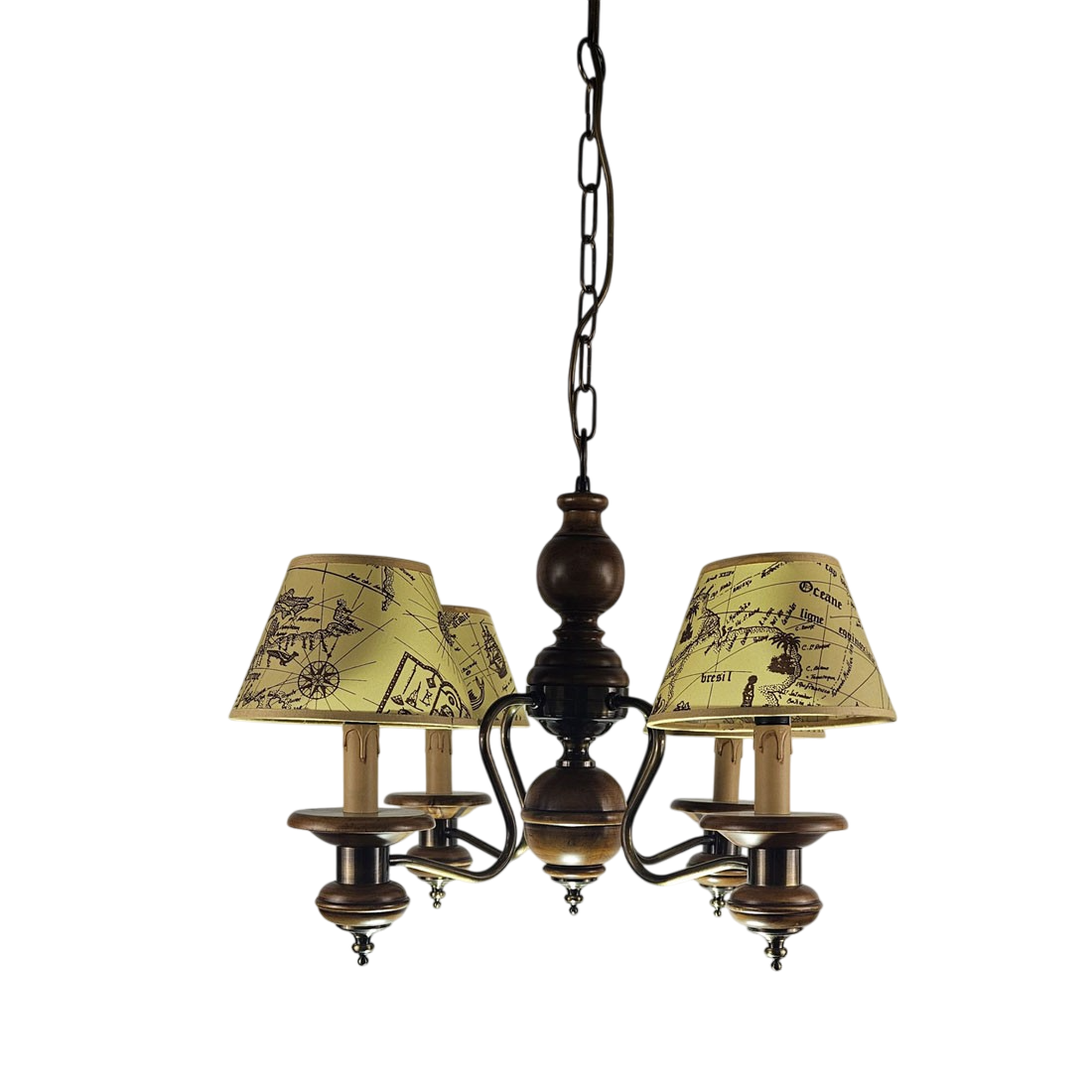 Lámpara de Techo rondeña terminada en latón envejecido y madera con pantallas pergamino américa.