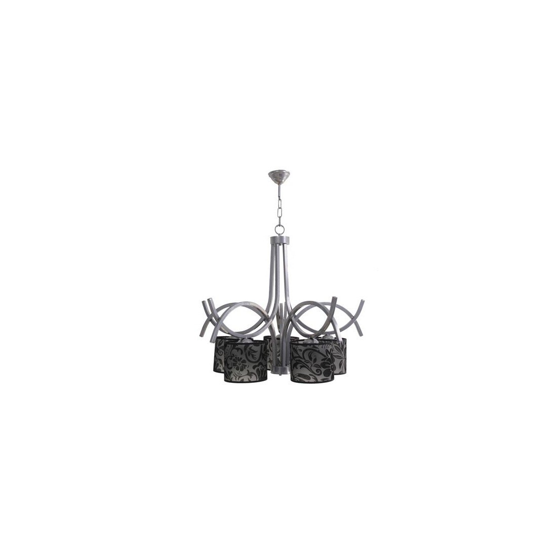 Lámpara de Techo de 5 Luces, Forja Cromo y pantallas de tela estampadas negras de 16 cm de diámetro.