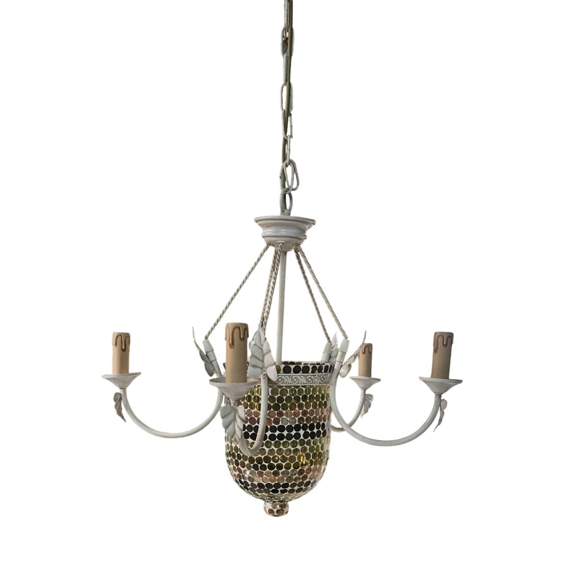 Lámpara de techo con 6 luces realizada en metal beige decape con detalle de hojas y cristal mosaico.