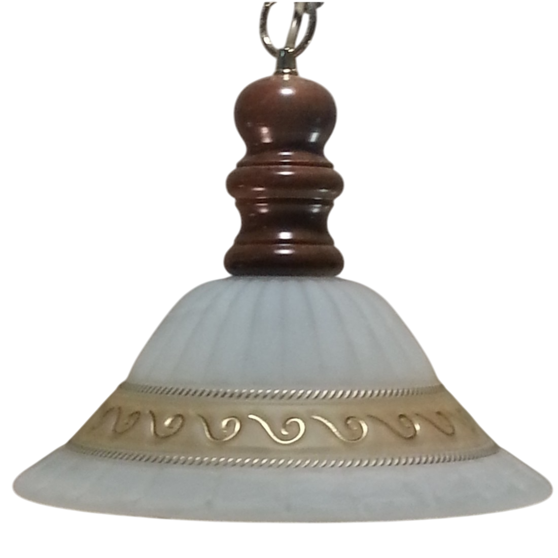 Lámpara de Techo Colgante con tulipa de cristal con cenefa de 30 cm de diámetro, soporte de madera acabado nogal, altura ajustable.
