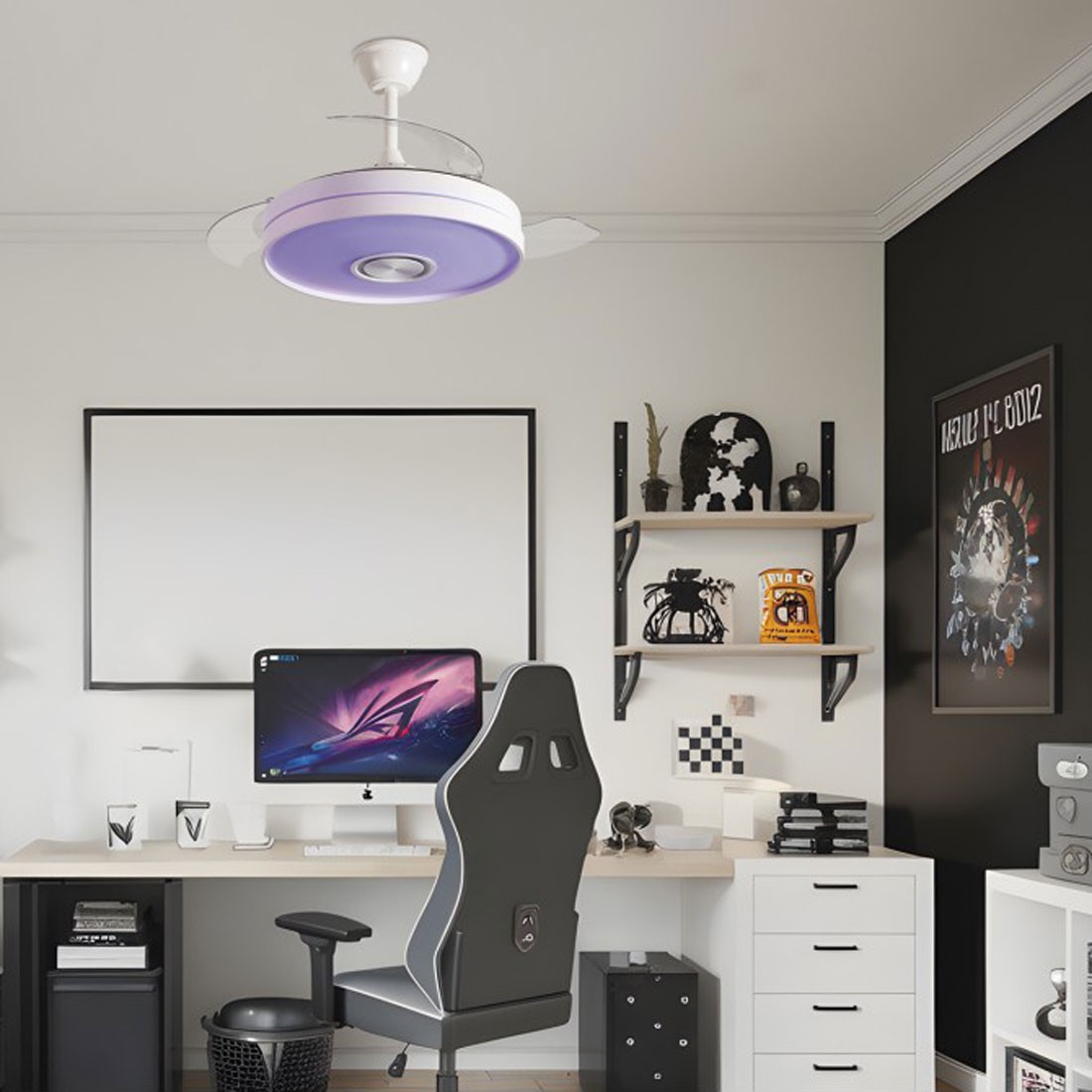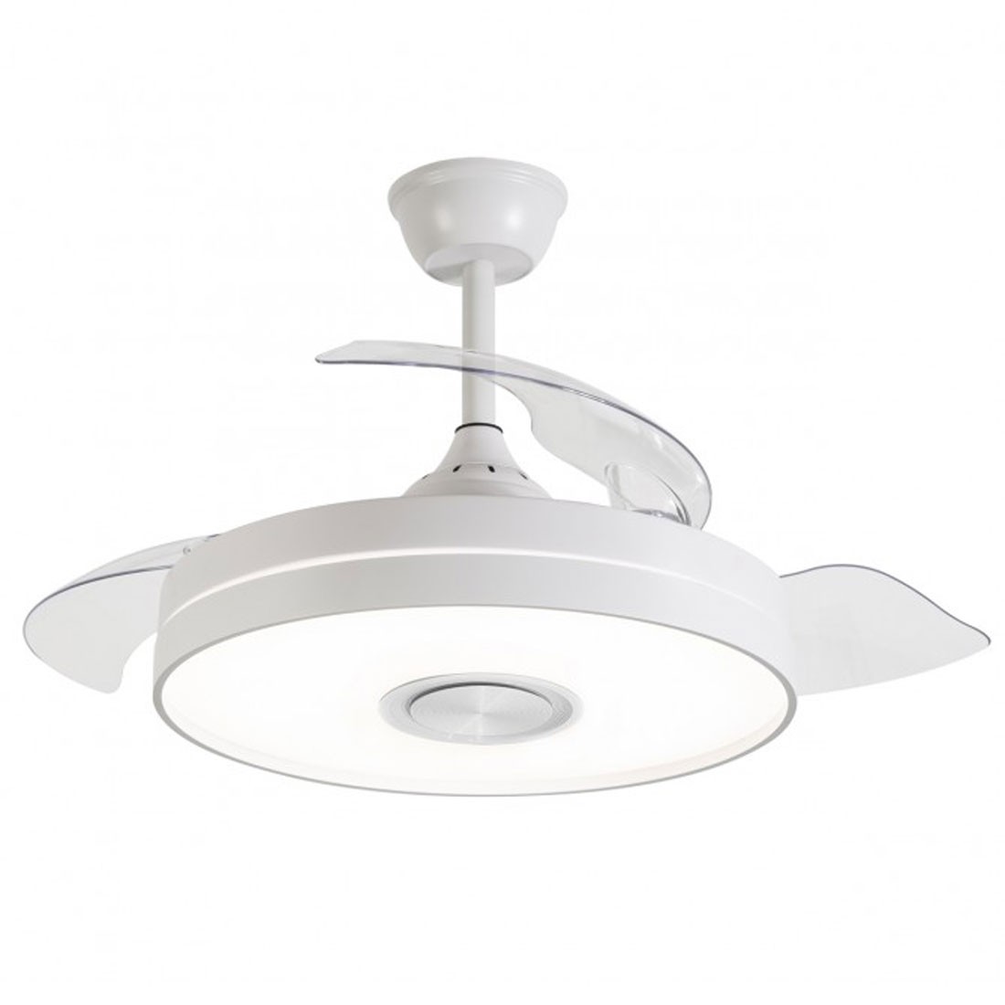 Ventilador Led, cuerpo de metal y acrílico acabado blanco con 3 aspas desplegables transparentes. Mando a distancia incluido con temporizador.