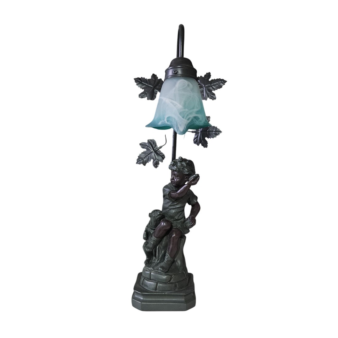 Lámpara de sobremesa con figura de niño con perro realizada en resina y forja.