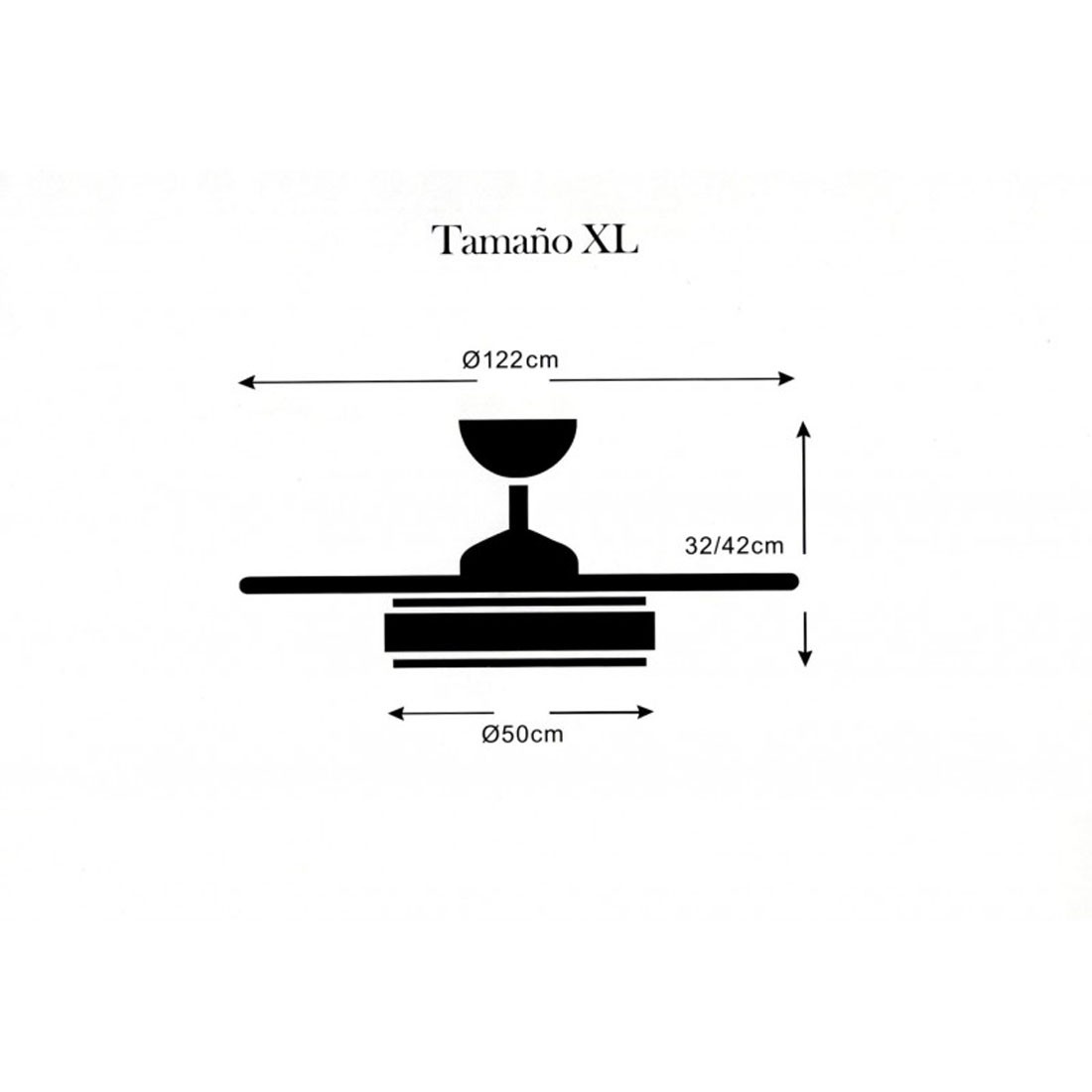 Ventilador de Techo led de Metal y acrílico acabado cuero con 4 aspas color transparente y Difusor PVC. 122 cm de diámetro. Mando a distancia incluido. 6 Velocidades. Motor DC 35W . Memoria mando a distancia e interruptor. App. Doble tija.